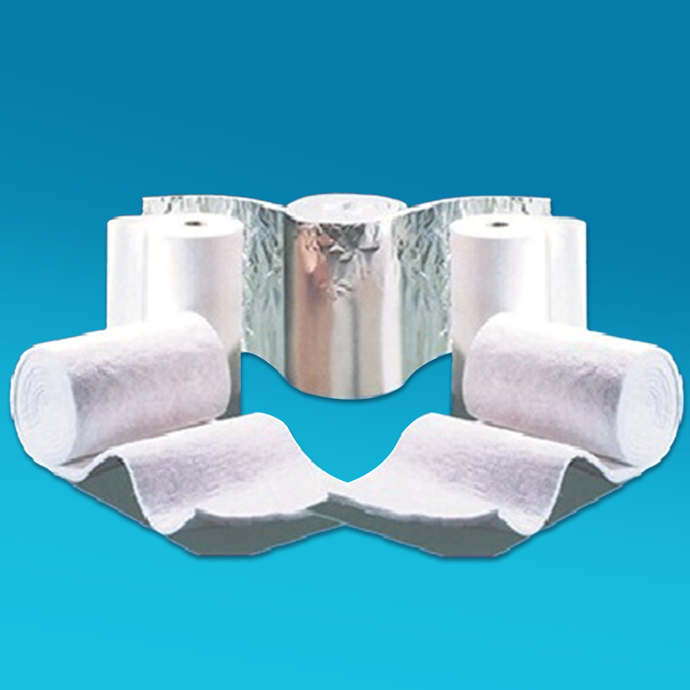 云緯覆鋁箔針刺毯是在現(xiàn)有陶瓷纖維計刺毯的基礎上利用專用機械,通過專用粘結劑將金屬鋁箔平整地覆到針刺毯表面形成的一種復合產品。由于在針刺毯表面增加了一層致密 的金屬鋁箔層,有效屏蔽了熱量透過纖維毯向空氣的對流,對輻射熱量形成有效反射,從而極大地提高了產品的絕熱性能。